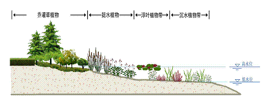 生態(tài)護(hù)岸技術(shù)以濱水生態(tài)緩沖帶結(jié)構(gòu)和功能為依據(jù),以透水性護(hù)岸材料的使用為手段,改善傳統(tǒng)硬質(zhì)不透水護(hù)岸對(duì)于水體橫向連通性阻斷影響。以護(hù)岸為基線,結(jié)合濱水濕生植物群落和陸生植物群落的合理配置和恢復(fù),在沿河帶狀空間內(nèi),構(gòu)建具有面源污染物攔截凈化作用生態(tài)廊道,并達(dá)到一定的景觀效果。